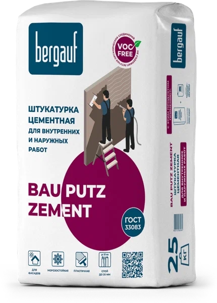 Штукатурка цементная Bergauf Bau Putz Zement с повышенной водо- и морозостойкостью для фасадов. Состав: цементное вяжущее, фракционированный песок, минеральные наполнители, модифицирующие полимерные добавки.