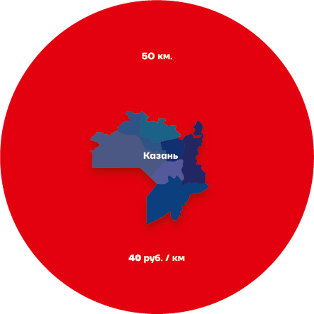 Стоимость услуг по доставке в населенные пункты, находящиеся за административной границей города Казани, производится из расчета стоимости Зоны 1 + 40 руб./км (оплачивается километраж от границы Зоны 1 до клиента, в обе стороны), но не далее, чем 50 км от границ г. Казани. Учитывается пробег в оба конца пути.